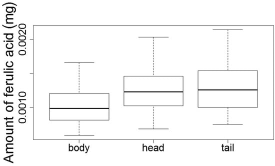 Amounts of ferulic acid between parts of the root. Error bars represent the 95% confidential intervals (head, n = 20; body, n = 19; tail, n = 19).