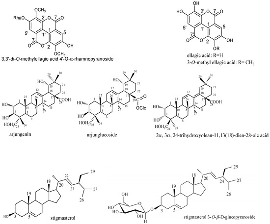 A portion of 180 g of the extract was subjected to medium pressure flash chromatography over silica gel (Merck, 70–230 mesh) using mixtures n-hexane-EtOAc of increasing polarity ((70:30)–(0:100)) and EtOAc–MeOH ((95:5)–(50:50)), resulting in the collection of 75 fractions of 500 mL each, which were combined on the basis of TLC analysis to create four fractions labeled T1–T4. Fraction T1 (m = 14.4 g) obtained from the mixtures of n-hexane-EtOAc (100:0 to 70:30) was subjected to silica gel column chromatography, eluted with n-hexane-EtOAc, and yielded oils stigmasterol (23 mg) and arjungenin (7 mg). From fraction T2 (m = 60.3 g), eluted with n-hexane-EtOAc ((50:50)–(25:75)), stigmasterol 3-O-β-d-glucopyranoside (12 mg), arjungenin (17 mg), 2α,3α,24-trihydroxyolean-11,13(18)-dien-28-oic acid (5.0 mg) and arjunglucoside (6 mg) were isolated. Column chromatography of fraction T3 (m = 55.0 g) on silica gel and eluted with the mixtures of EtOAc–MeOH ((100:0)–(85:15)), yielded 3,3′-di-O-methylellagic acid 4′-O-α-rhamnopyranoside (32 mg), arjungenin (12.0 mg), arjunglucoside (3.5 mg), 2α,3α,24-trihydroxyolean-11,13(18)-dien-28-oic acid (3.5 mg) and a dark mixture that was subjected to column chromatography on Sephadex LH-20 with MeOH as an isocratic eluent and yielded 3-O-methyl ellagic acid (12.5 mg). Fraction T4 (m = 56.18 g) obtained with the solvent system of EtOAc–MeOH (85:15 to 65:35) was a complex mixture and thus was not studied. All the isolated compounds were screened as described above for anti-yeast activity, and as described below for enzyme inhibition activities.