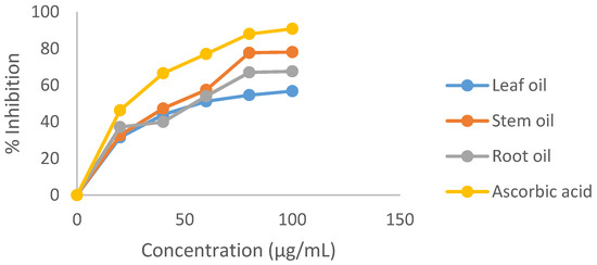 The DPPH radical scavenging activity of E. foetidum essential oils is depicted in Figure 1. The plot indicates the scavenging ability of the oils as percent inhibition at various concentrations; the scavenging effect was concentration dependent. This was demonstrated by the oils ability to act as hydrogen atoms or electrons donor in the conversion of the stable purple coloured DPPH to the reduced yellow coloured DPPH-H. Ascorbic acid (100 µg/mL) showed the highest percent inhibition (90.79%), followed by the stem oil (78.08%), root oil (67.53%) and leaf oil (56.76%). DPPH radical activity is usually presented with their IC50 value. The IC50 values for stem, root and leaf oils were 46 µg/mL, 54.5 µg/mL and 56 µg/mL respectively while ascorbic acid showed 22 µg/mL.