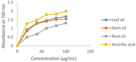 The reducing power of the essential oils was determined according to the method of Oyaizu [21]. Various concentrations (20, 40, 60, 80 and 100 µg/mL) of essential oils and ascorbic acid were mixed with phosphate buffer (2.5 mL, 0.2 M, pH 6.6) and 1% (w/v) of potassium ferricyanide water solution (2.5 mL). The mixture was incubated at 50 °C for 20 min. Aliquots of trichloroacetic acid (2.5 mL, 10%, aqueous solution (w/v)) were added to the mixture and centrifuged at 3000 rpm for 10 min. The supernatant (2.5 mL) was mixed with distilled water (2.5 mL) and a freshly prepared ferric chloride solution (0.5 mL, 0.1% (w/v)). After 30 min of incubation at room temperature in the dark, the absorbance of the solution was measured at 700 nm. The experiment was performed in triplicate and the average absorbance noted for each measurement. Higher absorbance indicates higher reducing power. The ferric-reducing capacity of the essential oils and standard compound were expressed graphically by plotting the absorbance against concentration.