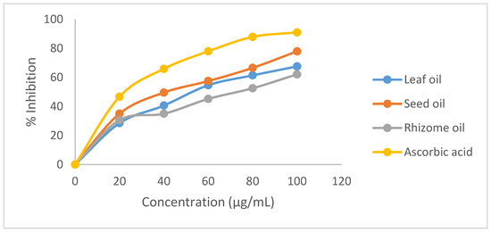 The leaf, seeds and rhizome of A. danielli are the most frequently used plant portions and are implicated in folkloric claims. Therefore, the antioxidant assays were carried out on these targeted plant parts. Figure 1 is a presentation of the DPPH radical scavenging activity of A. danielli leaf, seed and rhizome essential oils compared with the standard compound, ascorbic acid. The plot indicates the scavenging ability of the oils as a percent inhibition at various concentrations; the scavenging effect was concentration dependent. This was demonstrated by the volatile oils’ ability to act as a hydrogen atoms or electrons donor in the conversion of DPPH radical to DPPH-H. The seed oil exhibited the highest percent inhibition in the assay (77.96%, 100 µg/mL) compared with the leaf and rhizome oils (67.59% and 62.11%, respectively, 100 µg/mL), while ascorbic acid showed 91.00% inhibition. DPPH radical activity is usually presented with an IC50 value. The IC50 values for leaf, seed and rhizome oils were 58.5 µg/mL, 45.5 µg/mL and 72.0 µg/mL, respectively, while ascorbic acid showed a value of 20.5 µg/mL.
