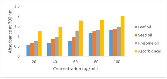 The concentration-dependent, ferric-reducing potential of A. danielli oils and ascorbic acid (as a function of absorbance at 700 nm) is shown in Figure 2. The reducing capacity of the volatile oils and standard compound increased with a corresponding increase in concentration. The FRAP assay indicated the higher reduction ability of the rhizome oil, followed by the seed and leaf oils (1.454, 1.376 and 1.305, respectively, at 100 µg/mL). This is an indication of the A. danielli oil constituents’ ability to reduce the (Fe3+) to (Fe2+) by electron transfer. The ferric ion reduction ability of ascorbic acid in the assay (100 µg/mL, 1.995) was relatively higher than the absorbance values for the volatile oils. The relatively moderate oxygenated proportion of the A. danielli rhizome oil may have afforded the observed antioxidant potency in the FRAP assay.