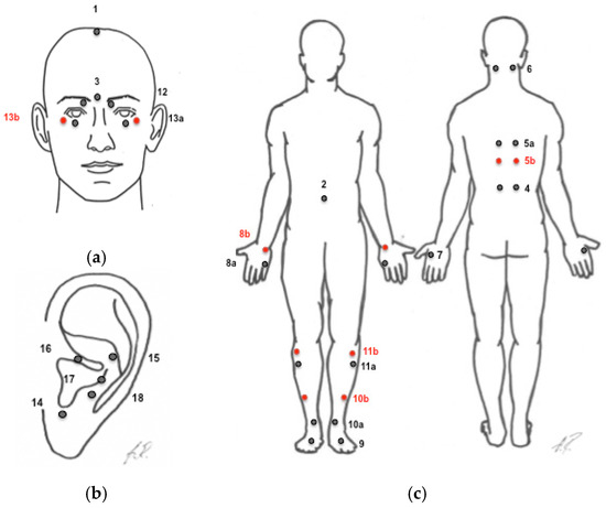 Needle acupuncture of the body and the ears was performed following standardized protocol (Table 1). The approximate location of the needles on the face and the ears are presented on (a,b); and on the body - on (c). The needles at LI-4 (He Gu), CV-6 (Qi Hai), LV-3 (Tai Chong), and all ear needles were manually stimulated once in each session after 15 min (+/−5 min). Treatment 1 (labelled in black) alternated with treatment 2 (labelled in red, see also in Table 1).