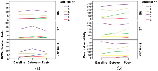 Line diagrams representing the individual patient’s examination data (presented separately for the RE: right eye; for the LE: left eye and for both eyes: binocular); (a) BCVA, Snellen charts; (b) Contrast sensitivity. The acupuncture effect was analyzed at the beginning (1: baseline-), after five acupuncture sessions (2: between) and at the end of the acupuncture treatment (3: post-).