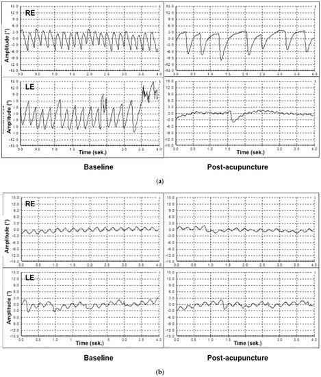 Nystagmography pictures in two patients (a); (b) baseline and following acupuncture treatment, as described bellow.
