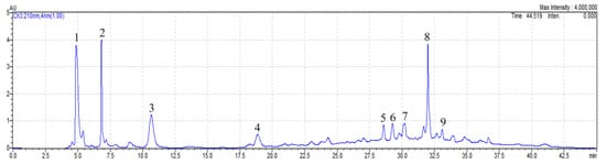 Figure 1 shows the HPLC chromatogram of the PAM extract detected at 210 nm. Based on the retention time of bioactive compounds, nine major fractions, numbered F1 to F9, were isolated from the PAM extract and collected using an auto fraction collector. These included: F1: 4.72–5.40 min, F2: 6.65–7.11 min, F3: 10.10–11.20 min, F4: 18.40–19.35 min, F5: 28.40–28.85 min, F6: 29.02–29.60 min, F7: 30.00–30.50 min, F8: 31.75–32.34 min, and F9: 32.90–33.30 min. The dried weight of the powdered PAM fractions after freeze drying were obtained as follows: F1: 1.093 g, F2: 0.925 g, F3: 1.507 g, F4: 1.401 g, F5: 0.858 g, F6: 0.801 g, F7: 0.695 g, F8: 1.059 g, and F9: 0.534 g, which were then used for the assessment of antioxidant and cytotoxic activities. However, the PAM fractions have not yet been identified in this study, therefore further study may be required to characterize these PAM fractions and purify them for further applications. Nguyen at al. [4] also used a HPLC system coupled to an auto fraction collector to isolate completely four major fractions from P. trimera root methanol extract for assessing their antioxidant and cytotoxic capacities.