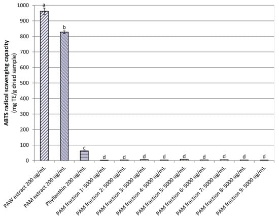 ABTS radical scavenging capacity of powdered P. amarus water (PAW) and methanol (PAM) extracts and PAM fractions. Phyllanthin was used as a positive control. Different letters within the columns denotes a significant difference between treatments (p < 0.05).