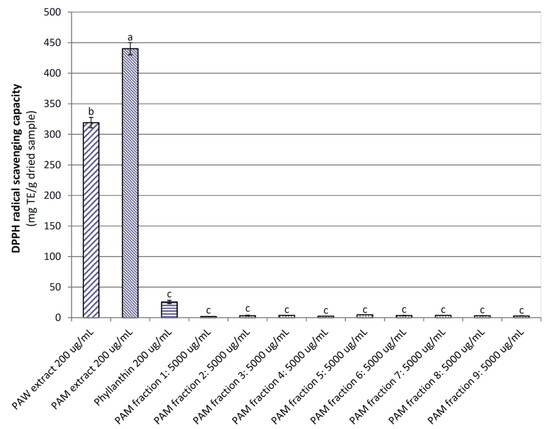 In contrast, the DPPH radical scavenging capacity (DRSC) of the PAM extract (440.13 mg TE/g dried sample) was significantly higher (p < 0.05) than those of the PAW extract, phyllanthin, and the nine PAM fractions (319.14, 25.62, and 1.89–4.68 mg TE/g dried sample, respectively; Figure 3). The higher contents of phenolics, flavonoids, and proanthocyanidins in the PAM extract mainly contributed to its stronger DRSC when compared to the PAW extract [34]. Previous studies have also indicated a positive correlation between phenolics, flavonoids, and proanthocyanidins and the DRSC of P. trimera root [35] and P. amarus [16]. The study [36] showed the P. amarus extract and phyllanthin concentrations for maximum DRSC were 300 μg/mL and 20 μmol/mL, with the IC50 being 162.3 μg/mL versus 7.4 μmol/mL.