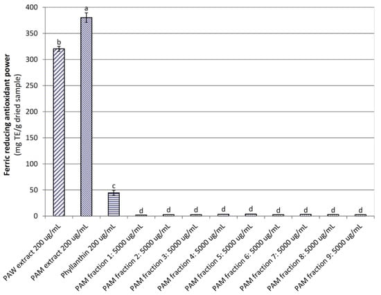 Similar to the DRSC, the ferric reducing antioxidant power (FRAP) of the PAW extract, phyllanthin, and nine PAM fractions (320.39, 44.57, and 2.14–3.83 mg TE/g dried sample) was significantly lower (p < 0.05) than that of the PAM extract (380.22 mg TE/g dried sample; Figure 4). Strong FRAP of both PA extracts would have also been as a consequence of their high phenolic, flavonoid, and proanthocyanidin contents. This outcome is supported by previous studies, which reported that the FRAP of the extracts had a positive correlation with their TPC, for example, E. robusta leaf [28], E. tirucalli [37], and P. amarus [16].