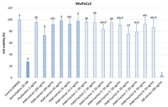 Viability of MiaPaCa2 cells treated with different concentrations of powdered P. amarus methanol (PAM) extract and fractions. DMSO was used as a control; gemcitabine and phyllanthin were used as positive controls; and quillajia bark (QB) extract was used as a comparative sample. Different letters within the columns denotes a significant difference between treatments (p < 0.05).