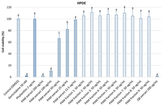 Viability of HPDE cells treated with different concentrations of powdered P. amarus methanol (PAM) extract and fractions. DMSO was used as a control; gemcitabine and phyllanthin were used as positive controls; and quillajia bark (QB) extract was used as a comparative sample. Different letters within the columns denotes a significant difference between treatments (p < 0.05).