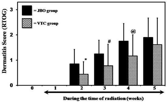 Different in the degree of radiation-induced dermatitis (Student’s “t” test * is p < 0.02; # is p < 0.05 and @ is p < 0.03).