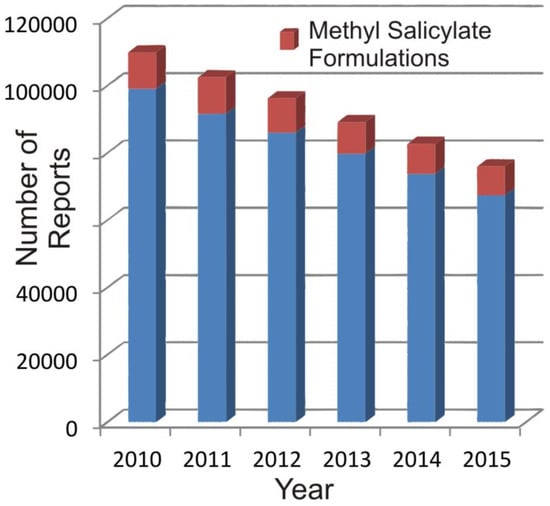 The ubiquity of salicylates in over-the-counter (OTC) topical pain medications has long given rise to concerns over their potential for misuse and accidental poisoning [51,52]. The high morbidity and mortality of paediatric referrals after ingestion of preparations containing oil of wintergreen has been of particular importance as, in its freshly distilled form, it contains over 98% MS [52,53,54,55,56]. It is widely established that the ingestion of a single teaspoon (~5 mL) of the oil, whether synthetic or natural, can be equivalent to almost 22 conventional aspirin tablets giving rise to a potentially acute toxic dose of salicylate [51]. Fortunately, the incidence of referrals due to MS has been in decline in recent years (Figure 1) with the overall fall being indicative of increasing numbers of alternatives, such as diclofenac and ibuprofen-based preparations. It is important to note that case reports involving MS, as a percentage of all issues involving topical agents, has stayed relatively constant at 10–11% over the past decade [13,14,15,16,17,18].