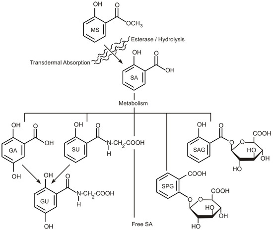 One of the more recent studies examining the transdermal influence of MS application in human volunteers was performed by Morra and colleagues (1996) [42]. An ointment containing 12.5% MS was applied to twelve volunteers (six male, six female) twice daily over a period of four days and the salicylate concentrations within serum analysed prior to dosing and at various intervals between subsequent applications. Urine was also collected during the entire study. While salicylate was found within the serum, at no point was unchanged MS detected, despite its relatively high loading within the ointment—confirming its rapid hydrolysis upon absorption. Serum salicylate concentrations ranged from 0.3–0.9 mg/L within the first hour of application and increased to 2–6 mg/L by day 4. Salicylic acid, along with its uric acid (SU) conjugates, were detected in the urine at concentrations of 15.6 and 491.9 mg/L, respectively. The relative proportions of the various metabolites in urine can be highly variable and dependent on both therapeutic dose and pH. The typical compositional breakdown under moderate doses yields: free salicylic acid (10%), salicyluric acid (75%), salicylic phenolic glucuronide (10%), salicylic acyl glucuronides 5%), and gentisic acid (less than 1%). Gilman (1990), however, demonstrated that under acid or alkaline conditions—the recovery of free salicylic acid could drift between 2 and 30% of the ingested drug [47]. The recovery of total salicylic acid over days 1–4 was 15.5, 22.0, 22.4, and 22.2%, respectively [42]. In humans, it has been estimated that 12–20% of MS applied topically is directly absorbed within the first 10 h, but it is important to note that the composition of the actual product (ethanol, isopropanol, menthol, camphor, etc.) along with the condition of the skin can greatly influence the transport and hydrolysis kinetics [42].