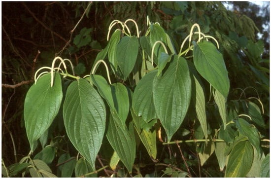 - Vila, R.; Tomi, F.; Mundina, M.; Santana, A.I.; Solís, P.N.; López Arce, J.B.; Balderrama Iclina, J.L.; Iglesias, J.; Gupta, M.P.; Casanova, J.; et al. Unusual composition of the essential oils from the leaves of Piper aduncum. Flavour Fragr. J. 2005, 20, 67–69. [Google Scholar] [CrossRef]