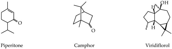A total of 90 compounds (Table 1) were found in the chromatogram of the EO obtained by gas chromatography coupled with mass spectrometry (GC-MS). The essential oil of P. aduncum from Cuba was dominated by oxygenated monoterpenoids (50.3%) and oxygenated sesquiterpenoids (29.2%), followed by monoterpene hydrocarbons (9.7%) and sesquiterpene hydrocarbons (8.2%), and an unidentified diterpenoid (2.0%). Piperitone, camphor, and viridiflorol (Figure 2) were the main components with 23.7%, 17.1%, and 14.5%, respectively.