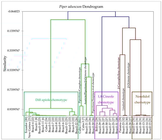 A total of 38 EO compositions of P. aduncum from the published literature, including the EO chemical makeup from this work, were treated as operational taxonomic units (OTUs). The percentages of 35 main essential oil compounds (α-pinene, β-pinene, myrcene, α-terpinene, limonene, 1,8-cineole, (Z)-β-ocimene, (E)-β-ocimene, terpinolene, linalool, camphor, borneol, terpinen-4-ol, α-terpineol, piperitone, α-copaene, β-caryophyllene, aromadendrene, α-humulene, germacrene D, valencene, asaricin, bicyclogermacrene, γ-cadinene, myristicin, δ-cadinene, epi-longipinanol, (E)-nerolidol, longipinanol, spathulenol, caryophyllene oxide, viridiflorol, dill apiole, τ-cadinol, and α-cadinol) were used to determine the chemotypic characteristics of the various P. aduncum essential oil compositions by agglomerative hierarchical cluster (AHC) analysis using the XLSTAT software, version 2015.4.01 (Addinsoft™, New York, NY, USA). To determine similarity, the Pearson correlation was used, and the clusters were defined using the unweighted pair-group method with arithmetic average (UPGMA).