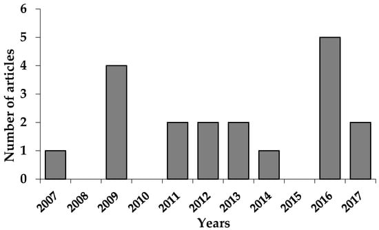 A total of 20 articles were obtained, of which one was repeated, thus resulting in a total of 19 original reports about studies of EO from P. aduncum. Results in this field appear in the last decade, with a particular increase after 2010 (Figure 4). The language used was English in 15 scientific journals. The most used journal was Pest Management Science with three articles (16%) followed by Molecules and Chemistry & Biodiversity with two articles (11%). The remaining journals published only one article each (5%): Annals of Academia Brasileira Ciencia, Bulletin of Entomological Research, Experimental and Applied Acarology, Iranian Journal of Arthropod-Borne Diseases, Journal of the American Mosquito Control Association, Memórias do Instituto Oswaldo Cruz, Natural Product Communications, Neotropical Entomology, Pharmaceutical Biology, Revista Brasileira de Parasitologia Veterinária, Tropical Biomedicine and Veterinary Parasitology. The source journals mainly include the fields of vectors > biology > parasitology > biomedicine. The first author’s institutional address displayed that only four countries are involved in these studies, with different research groups. Brazil was the predominant country (63%), followed by Cuba and Malaysia (16%), and finally New Guinea (5%).
