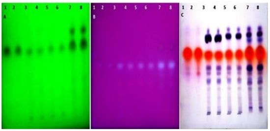 HPTLC fingerprint of different essential oils of seeds of T. ammi L. extracted using different extraction techniques (track 1–2: Hydrodistilled oil, 3–4: Solvent extracted oil, 5–6: Ultra sonication oil, 7–8: SC-CO2 oil) observed at (A) 254 nm, (B) 366 nm, (C) In daylight after derivatization by using the anisaldehyde sulphuric acid reagent.