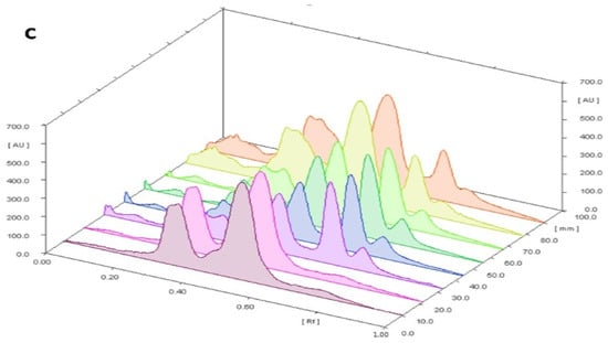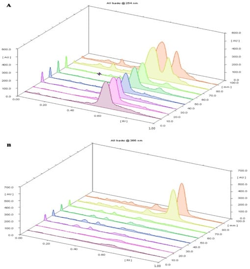 (A) 3D Chromatogram of 8 tracks of T. ammi L. oil obtained by different extraction techniques at A: 254 nm; (B) 3D Chromatogram of 8 tracks of T. ammi L. oil obtained by different extraction techniques at B: 366 nm; (C) 3D Chromatogram of 8 tracks of T. ammi L. oil obtained by different extraction techniques at B: 580 nm.