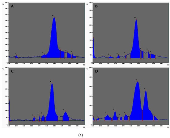 The comparative results of the different oils showed a dominant constituent at the Rf value 0.58 at 254 nm in the oil extracted by different extraction techniques at different area percentages. Substance N at Rf 0.66 showed a higher area percentage in the oil extracted by the supercritical critical fluid extraction technique at 366 nm as compared to the other extraction techniques. Substance M was present in maximum amounts in all of the oil samples at 254 nm and in only solvent extracted and supercritical fluid extracted oil at 366 nm. Substances A, E, G, and I were present in only the supercritical fluid extracted oil at 254 nm. 3D Chromatograms and HPTLC fingerprinting of the essential oils obtained from the various extraction techniques scanned at 254 and 366 nm are shown in Figure 3A,B, Figure 4a,b, respectively. The comparative results of the different oils are given in Table 3.