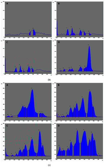 (a) HPTLC fingerprint of various essential oils of seeds of T. ammi L. extracted via diverse extraction methods. A: Hydrodistilled oil, B: Solvent extracted oil, C: Ultra sonicated oil, D: SC-CO2 oil observed at 254 nm with assigned substance; (b) HPTLC fingerprint of various essential oils of seeds of T. ammi L. extracted using different extraction methods. A: Hydrodistilled oil, B: Solvent extracted oil, C: Ultra sonicated oil, D: SC-CO2 oil observed at 366 nm with assigned substance; (c) HPTLC chromatograms of different oils of T. ammi L. Extracted using different extraction techniques. A: Hydrodistilled oil, B: Solvent extracted oil, C: Ultra sonication oil, D: SC-CO2 oil visualized at 580 nm with assigned substance.