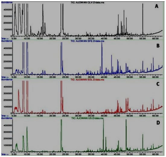 Comparative GC-MS chromatograms of different oils of T. ammi L. extracted using different extraction techniques. (A) Hydrodistilled oil, (B) Solvent extracted oil, (C) Ultrasonicated oil, (D) SC-CO2 oil.