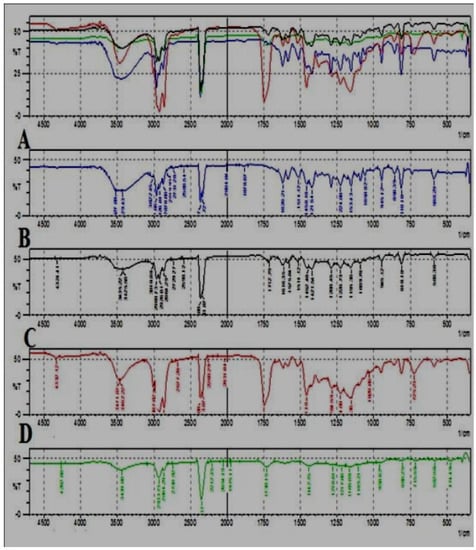 Comparative FTIR spectra of different oils of T. ammi L. extracted using different extraction techniques. (A) Hydrodistilled oil, (B) Solvent extracted oil, (C) SC-CO2 oil, (D) Ultrasonicated oil.