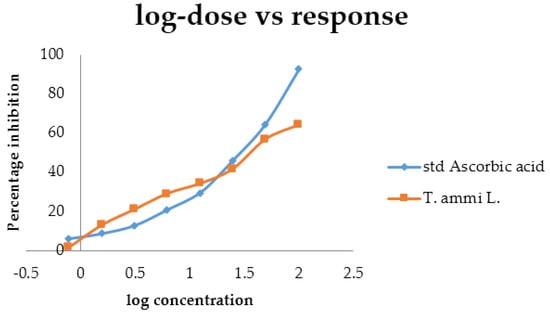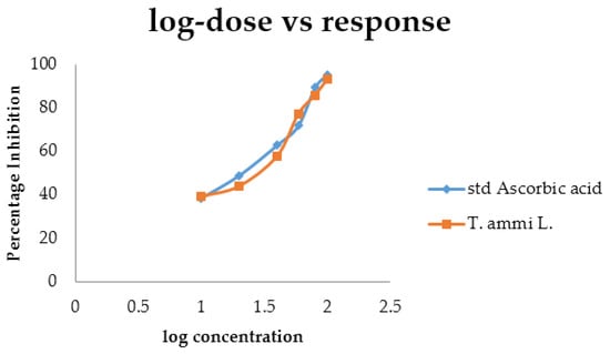 The T. ammi oil sample showed a significant concentration-dependent antioxidant activity by inhibiting the DPPH free radical with an IC50 value of 36.41 μg mL−1, whereas, an IC50 value for ascorbic acid was found to be 28.09 μg mL−1 used as a standard (Table 7 and Figure 7). It was found that the oil possesses hydrogen donating capabilities that are similar to ascorbic acid and acted as an antioxidant. The scavenging effect increased with increasing concentration of the extract and ascorbic acid (5.0–100 μg mL−1).