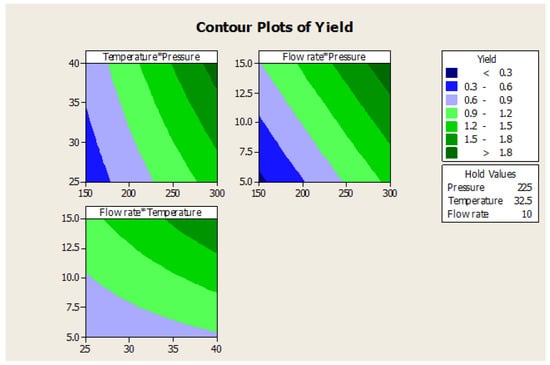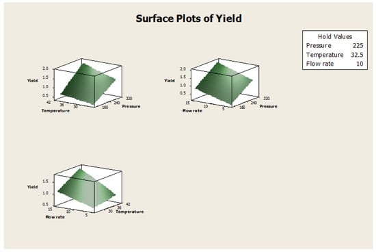 The FFD experiment was carried out to determine the effect that three factors (pressure, temperature, flow rate) with three levels had on the response (Yield). The results were analyzed and are shown in Table 9. It can be seen that the selected factors have a significant effect either directly or indirectly through the interaction with other factors. The selected factors were 85.42% fit model for the given data. The contour and surface plots have been shown in Figure 9 and Figure 10.
