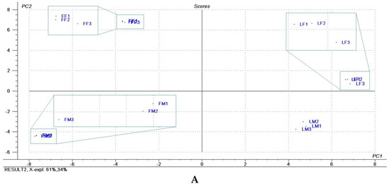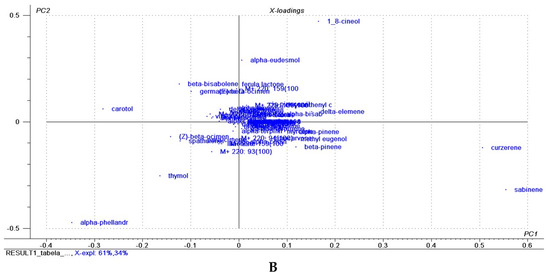 Figure 1. (A) Scores and (B) Loadings of Principal Component Analysis (PCA) of the chemical composition of Hedyosmum brasiliense essential oils; FF 1, 2, 3 = female flowers; FM 1, 2, 3 = male flowers; LF l, 2, 3 = female leaves; LM l, 2, 3 = male leaves.