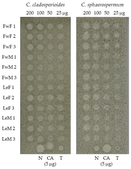 Figure 2. Preliminary antifungal activity of Hedyosmum brasiliense essential oils against Cladosporium cladosporioides and C. sphaerospermum. FwF = female flowers; FwM = male flowers; LeF = female leaves; LeM = male leaves; N = nystatin; CA = cinnamic acid; T = thymol.
