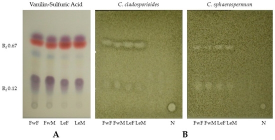 Figure 3. (A) Detection of terpenes of H. brasiliense essential oils by Vanilin-Sulfuric Acid (VS) spray reagent followed by heating to 110 °C; (B) Antifungal activity of Hedyosmum brasiliense essential oils, developed with n-hexane/acetone (90:10, v/v), against Cladosporium cladosporioides and C. sphaerospermum. Rf 0.67 = strong activity; Rf 0.12 = weak activity; FwF = female flowers; FwM = male flowers; LeF = female leaves; LeM = male leaves; N = nystatin.