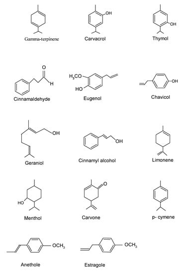 Several isoprene units (C5H8) upon combination result in the production of hydrocarbons called terpenes. Occurring in the cytoplasm of plant cells, biosynthesis of terpenes proceeds via the mevalonic acid pathway starting from acetyl-CoA. Having a backbone of hydrocarbons, cyclases can rearrange terpenes into cyclic structures, thus forming monocyclic or bicyclic structures []. Terpene biosynthesis consists of synthesis of the isopentenyl diphosphate (IPP) precursor, IPPs being added repetitively to form the prenyldiphosphate precursor of the various classes of terpenes, terpene-specific synthetase modification of the allylic prenyldiphosphate to form the terpene skeleton, and finally, secondary enzymatic modification (redox reaction) of the skeleton to attribute functional properties to the different terpenes []. Monoterpenes (C10H16) and sesquiterpene (C15H24) are the main terpenes, but longer chains such as diterpenes (C20H32), triterpenes (C30H40), etc., also exist. p-cymene, limonene, menthol, eugenol, anethole, estragole, geraniol, thymol, γ-terpinene, and cinnamyl alcohol are among the examples of some constituents of essential oils with antimicrobial activity (Figure 1). Angelica, bergamot, lemongrass, mandarin, mint, caraway, celery, citronella, coriander, eucalyptus, geranium, petitgrain, pine, juniper, lavandin, lavander, lemon, orange, peppermint, rosemary, sage, and thyme are among the representatives of plants with some of these compounds []. Oxygenated monoterpene (β-fenchol) and oxygenated sesquiterpene (α-eudesmol) were identified as the two main bioactive constituents in the essential oil obtained from fresh leaves of Eucalyptus teretecornis with a minimum inhibitory amount (MIA) of 28 μg and 10 μg against Alternaria alternata []. Similarly, another study reported β-fenchol and linalool as the two antimicrobial components in essential oil obtained from the fresh leaves of Zanthoxylum alatum [].