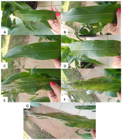Severity of the Curvularia Leaf Spot disease in maize plants, submitted to the inoculation with different conidia concentrations of Curvularia lunata. (A—Control; B—101 conidia mL−1; C—102 conidia mL−1; D—103 conidia mL−1; E—104 conidia mL−1; F—105 conidia mL−1; G—106 conidia mL−1).