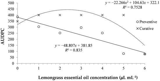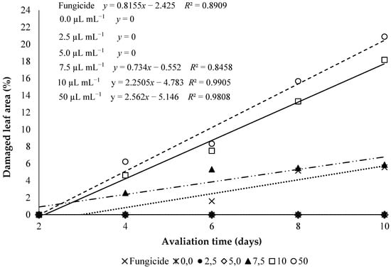 In the preventive and curative effects, the utilized concentrations were different from the tested in vitro (fungitoxicity) and in vivo (phytotoxicity), because from the concentration 7.5 µL mL−1, the plants presented phytotoxicity symptoms. Therefore, there were tested concentrations below the utilized in in vitro tests.