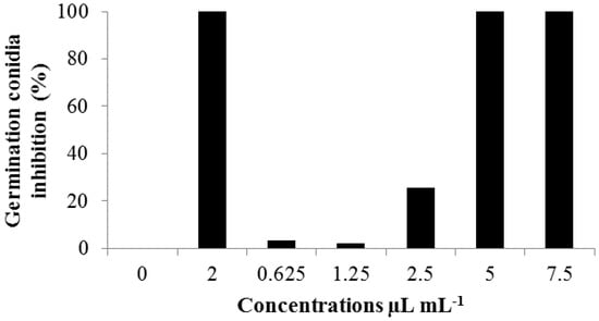 On the essay of C. lunata conidia germination inhibition, it was verified that it had 100% of conidia germination on the positive control (methyl-thiophanate). The concentrations of 5.0 and 7.5 µL mL−1 of the C. citratus oil also totally inhibited the conidia germination (Figure 3). Yet the concentrations 0.625; 1.25 and 2.5 µL mL−1 had a low inhibition percentage of 3.3%, 2.3%, and 25%, respectively, indicating oil activity upon the conidia, even in the lower concentrations.