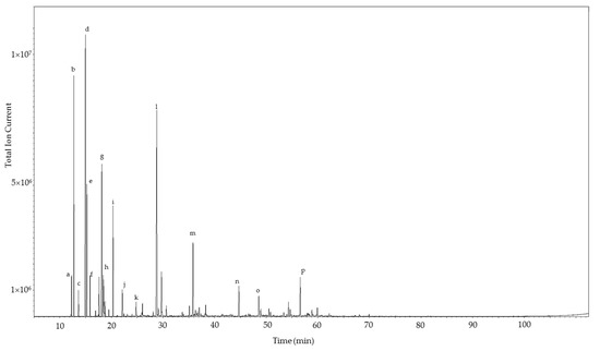Gas chromatogram of the leaf essential oil of Commiphora gileadensis. The major components are indicated: a, α-thujene; b, α-pinene; c, camphene; d, sabinene; e, β-pinene; f, myrcene; g, p-cymene; h, limonene; i, γ-terpinene; j, terpinolene; k, cis-p-menth-2-en-1-ol; l, terpinen-4-ol; m, bornyl acetate; n, (E)-caryophyllene; o, germacrene D; p, 1,10-di-epi-cubenol.