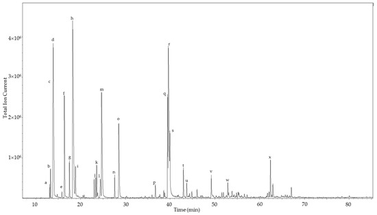 Chiral gas chromatogram of the leaf essential oil of Commiphora gileadensis. The major components are indicated: a, (+)-α-thujene; b, (−)-α-thujene; c, (+)-α-pinene; d, (−)-α-pinene; e, (+)-β-pinene; f, (−)-β-pinene; g, (+)-sabinene; h, (−)-sabinene; i, myrcene; j, (+)-limonene; k, α-terpinene; l, (−)-limonene; m, p-cymene; n, terpinolene; o, γ-terpinene; p, (−)-borneol; q, (+)-terpinen-4-ol; r, (−)-terpinen-4-ol; s, (−)-bornyl acetate; t, (−)-α-terpineol; u, (+)-α-terpineol; v, (E)-caryophyllene; w, germacrene D; x, 1,10-di-epi-cubenol.
