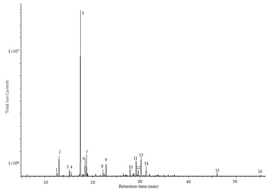 Gas chromatogram of the oleoresin essential oil of Protium amazonicum from Ecuador. 1, α-thujene; 2, α-pinene; 3, 3,7,7-trimethyl-1,3,5-cycloheptatriene; 4, β-pinene; 5, δ-3-carene; 6, p-cymene; 7, limonene; 8, m-cymenene; 9, p-cymenene; 10, α-phellandren-8-ol; 11, m-cymen-8-ol; 12, p-cymen-8-ol; 13, α-terpineol; 14, 4-methyleneisophorone; 15, α-trans-bergamotene; 16, caryophyllene oxide.