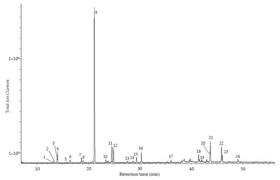 Chiral gas chromatogram of the oleoresin essential oil of Protium amazonicum. 1, (+)-α-thujene; 2, (−)-α-thujene; 3, (+)-α-pinene; 4, (−)-α-pinene; 5, (+)-β-pinene; 6, (−)-β-pinene; 7, 3,7,7-trimethyl-1,3,5-cycloheptatriene; 8, 1,8-cineole; 9, (−)-δ-3-carene; 10, (−)-limonene; 11, (+)-limonene; 12, p-cymene; 13, α-terpinolene; 14, γ-terpinene; 15, m-cymenene; 16, p-cymenene; 17, camphor; 18, α-phellandren-8-ol; 19, (−)-α-terpineol; 20, eucarvone; 21, (+)-α-terpineol; 22, m-cymen-8-ol; 23, p-cymen-8-ol; 24, α-trans-bergamotene.