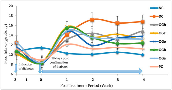 Effect of treatment with Ocimum gratissimum leaf fractions (250 mg/kg bw) on feed intake throughout the experimental duration. Data are presented as mean of 6 animals per group. NC: Normal control; DC: Diabetic control; PC: Positive control (Metformin (500 mg/kg bw); OGh: Ocimum gratissimum n-hexane fraction; OGc: Ocimum gratissimum chloroform fraction; OGe: Ocimum gratissimum ethyl-acetate fraction; OGb: Ocimum gratissimum n-butanol fraction; OGa: Ocimum gratissimum aqueous fraction.