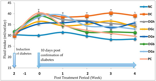 In this study, polyphagia, polydipsia, polyuria and concomitant reduction in body weight—which are classical symptoms and signs of diabetes [1]—were established in the diabetic negative control group (DC). Increased feed and fluid intake was observed in all the diabetic groups one week after confirmation of diabetes and in addition obvious weight loss was noticed in the DC when compared to the NC and OGLF treated groups. The increase in fluid intake may be the consequence of obligatory renal water loss combined with hyper-osmolarity in diabetes which tends to reduce intracellular water, triggering the osmo-receptor of the thirst centre of the brain and this result in polydipsia which leads to fluid intake [39]. There was a significant reduction in the amount of fluid and quantity of feed intake in the OGLF treated group when compared to the DC group. This could be due to the fact that OGLF improved significantly the classical symptoms of diabetes. Also, the observations suggest that OGLF influences the neuroendocrine regulation of feed intake by the GI system, together with nutrient sensing and peptide secretion by enteroendocrine cells. These findings corroborate previous studies [17,38].