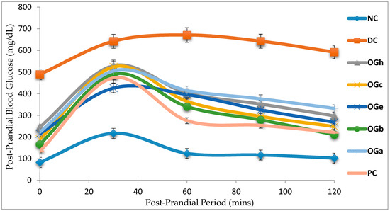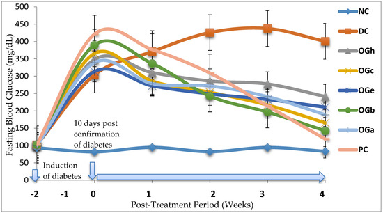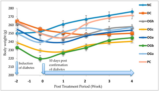 Figure 3 shows the changes in body weight of all the experimental animals. At day 10 post-confirmation of diabetes, a decrease in body weight was observed among the diabetic group. From the second week of treatment with the OGLF, a significant decrease (p < 0.05) in weight increase was observed among the diabetic rats treated with OGLF and PC groups when compared with the NC group. On the contrary, a decrease in body weight was observed in the DC group. With respect to all the diabetic treated groups, the OG n-butanol fraction treated group and the PC group had increased in body weight significantly (p < 0.05) in a comparable manner to the NC group (Figure 3).