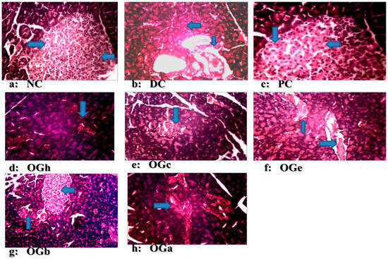 Photomicrographs of pancreatic tissues of diabetic/non-diabetic rats, treated with Ocimum gratissimum leaf fractions (250 mg/kg bw) for 28 days (H & E stain 100×). (a) NC: Normal control (non-diabetic group): section shows normal histology of pancreas with high number of ß-cells. (b) DC: Diabetic control: islets show highly dispersed and morphologically deformed ß-cells. PC: Positive control (Metformin 500 mg/kg bw): it has normal arrangement of islet cells and their ß-cells are likened to that of the NC group. (c) OGh: Ocimum gratissimum n-hexane fraction; (d) OGc: Ocimum gratissimum chloroform fraction; (e) OGe: Ocimum gratissimum ethyl acetate fraction; (f) OGb: Ocimum gratissimum n-butanol fraction; (g) OGa: Ocimum gratissimum aqueous fraction. The OGh, OGc, OGe, OGb, OGa groups had better structural architecture compared to the DC group but morphologically distorted ß-cells. The OGh and OGc shows sign of regeneration but cellularity is less pronounced as compared to OGb.