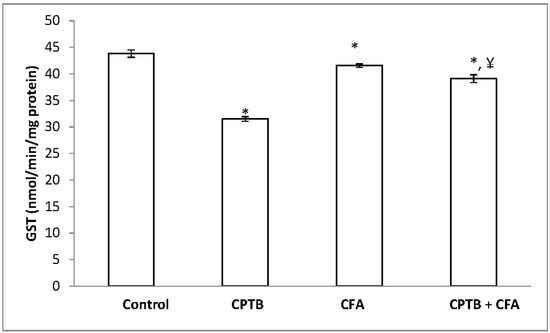 Influence of caffeic acid on capecitabine-induced changes in hepatic GST activity in rats. Data are expressed as means ± SD for six rats in each group; * significantly different from the control (p < 0.05); ¥ significantly different from the capecitabine group (p < 0.05).