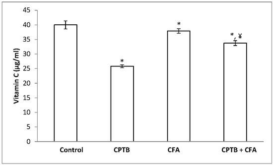 Protective effect of caffeic acid on the reduction of hepatic ascorbic acid (vitamin C) levels in rats due to capecitabine-induced toxicity. Data are expressed as means ± SD for six rats in each group; * significantly different from the control (p < 0.05); ¥ significantly different from the capecitabine group (p < 0.05).