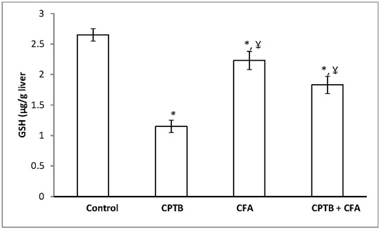 Jollow et al.’s method [29] was used to evaluate the level of hepatic GSH in the liver. The chromophoric product resulting from the reaction between Ellman’s reagent, 5,5′-dithiobis-(2-nitrobenzoic acid) and reduced glutathione possesses a molar absorption at 412 nm.