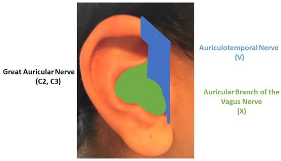 - Peuker, E.T.; Filler, T.J. The nerve supply of the human auricle. Clin. Anat. 2002, 15, 35–37. [Google Scholar] [CrossRef] [PubMed]