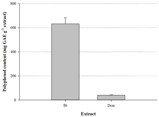 Total polyphenol content of the dichloromethane (Dcm) and n-butanol (Bt) fractions of S. mucronata. Bars indicate standard deviation.
